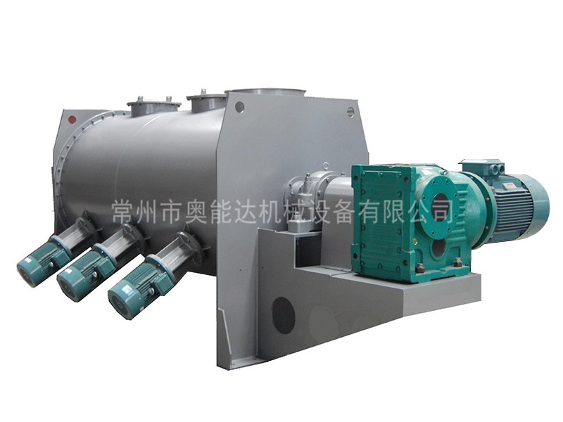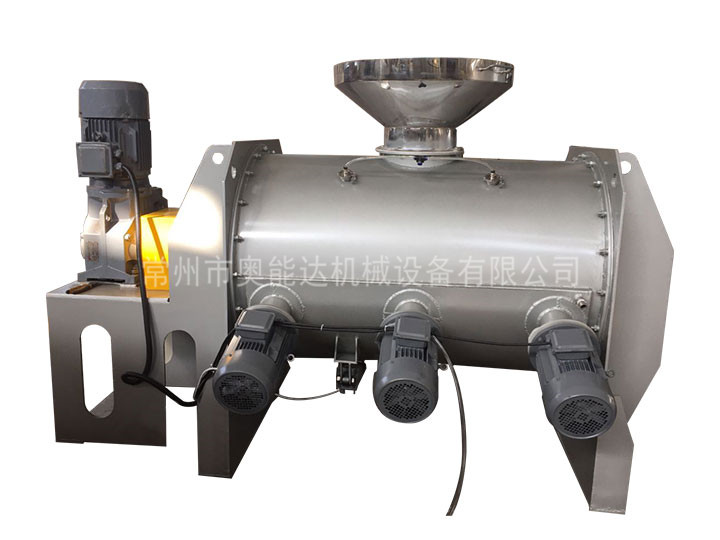 犁刀混合機,由主軸減速機帶動犁刀組軸運動,一部分將物料沿筒體圓周作徑向運動,同時將物料沿犁刀兩側的法線方向拋出,另一部分被拋出物料經飛刀組時,被高速旋轉的飛刀剪切攪拌也適合粘狀、稠狀、塊狀固—固(粉體與粉體)、固—漿(粉體與膠漿液)的物料或密度差異大的物料也能混合。